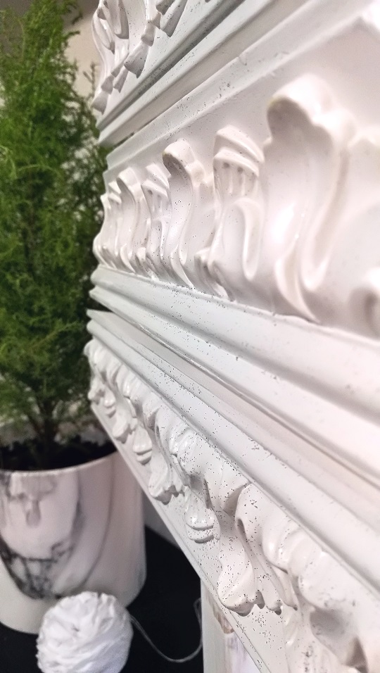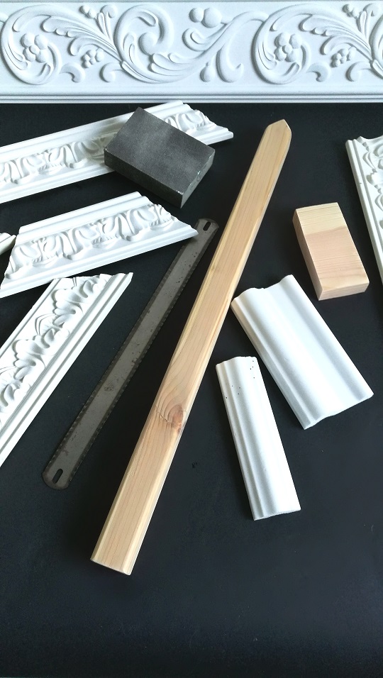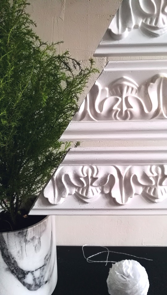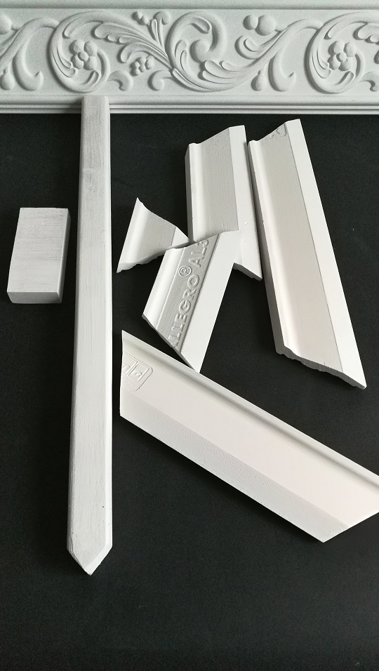 Skrawki listew przycięłam pod kątem. Bardzo fajnie się je przycina brzeszczotem, a nawet nożem kuchennym. Nie sypią się jak listwy ze styropianu. Dźwięk podczas cięcia też o wiele milszy ;).