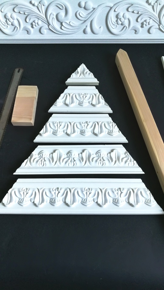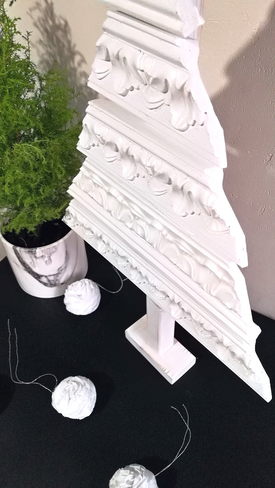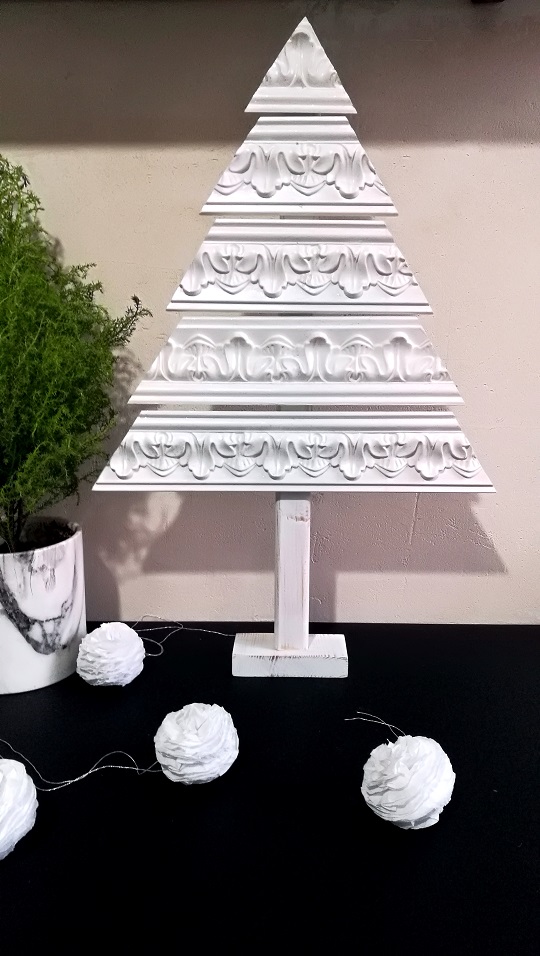Moja choinka jest z listew sztukateryjnych z poliuretanu od Aniro. Równie dobrze możecie wykorzystać stare listwy przypodłogowe.