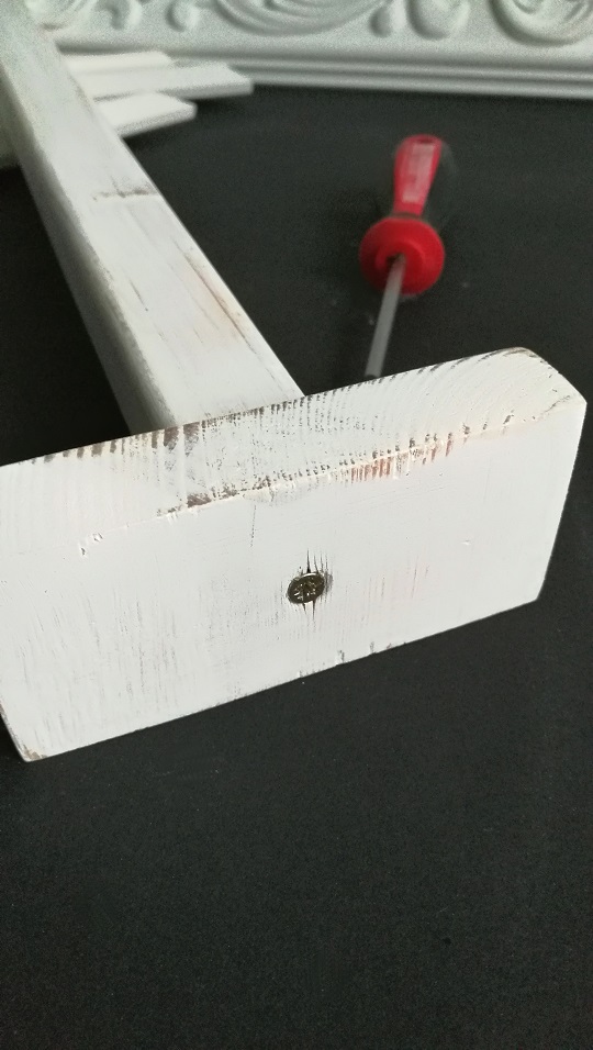 Na drewnianych elementach zrobiłam przetarcia, wygładziłam podniesiony „włos” drewna i skręciłam w całość.