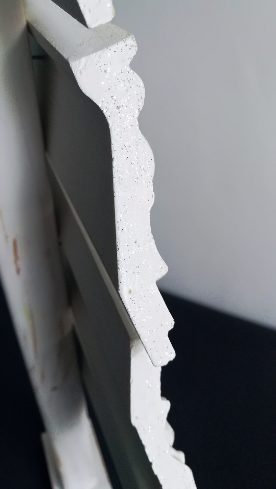 Listwy sztukateryjne po od drugiej strony są żółtawe. Po przycięciu, boki również. Pomalowałam je białą farbą akrylową. Tej samej farby użyłam do malowania deski i „pnia” choinki.