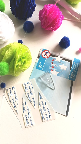 Zamiast wiercić dziury, użyłam przeźroczystego haczyka tesa® do szyb. Zwykle przyklejam haczyki zgodnie z ich przeznaczeniem ale w wypadku tej dekoracji, która jest bardzo lekka, bez problemu będzie trzymał się ściany i prawie go nie widać. Swoją drogą te haczyki zostały mi z zeszłorocznych dekoracji okna. Plasterków klejących było więcej, więc i w tym roku się przydadzą.