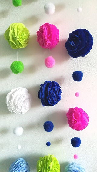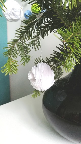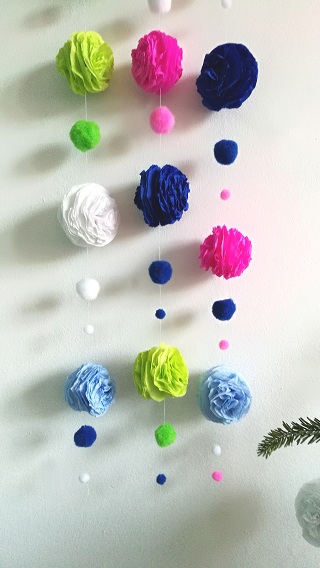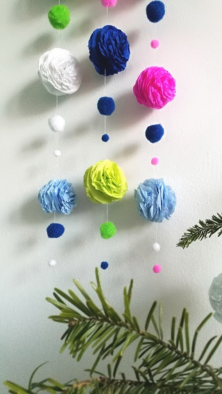 Ostatnio pokazywałam jak zrobić bombki z bibuły. Możecie je powisieć na choince, gałązkach igliwia, w oknie lub na gałęzi. W połączeniu z gotowymi pomponami przyniesie dużo szczęścia w nowym roku, a już na pewno będzie cieszyć oczy :). Czy ja już mówiłam, że to dziecinie prosta dekoracja do wykonania?