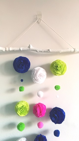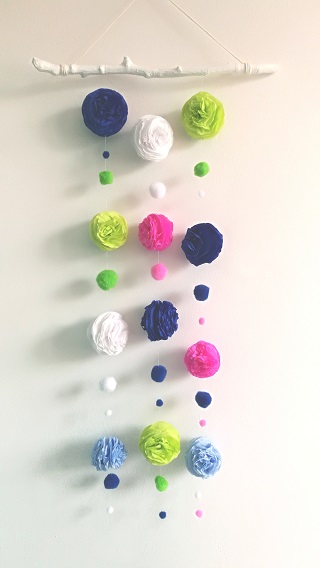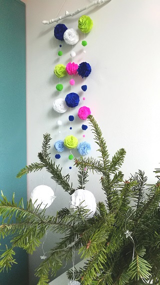 Dowiązałam sznurek i powiesiłam. Łatwiej jest wieszać pompony na zawieszonej gałęzi. Nitki się nie poplączą i mamy pogląd na całość dekoracji.