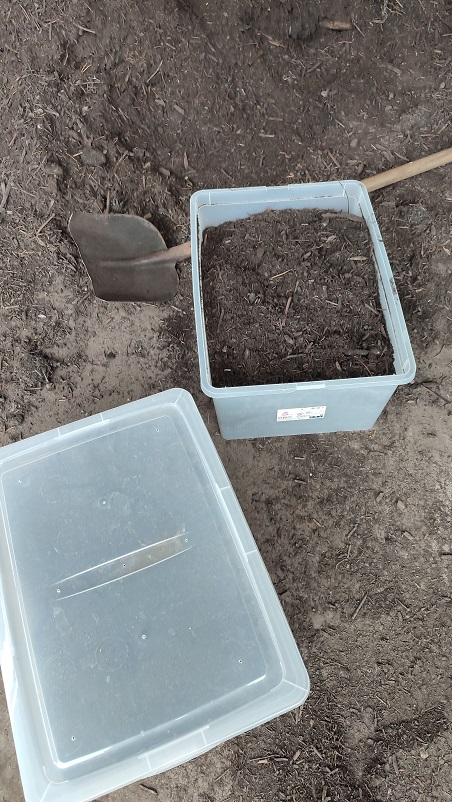 Na głównym zdjęciu, macie to samo ujęcie łopaty z opisem kompostu. Dwa tygodnie później pojawiły się też rękawiczki. Polecam mieć swoje, ale miło.