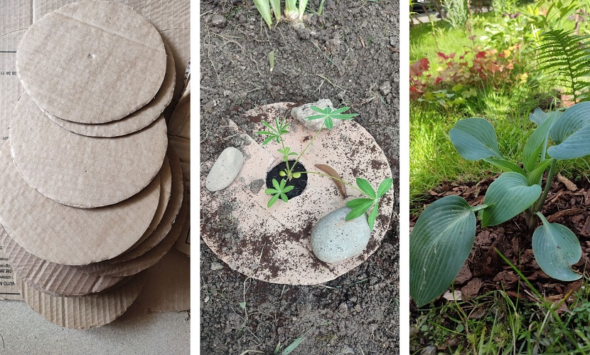 Nie ma konieczności wycinana takich ślicznych kółek z kartonu. Ważne za to jest, aby karton był bez nadruku ( gazety się nie nadają) i bez taśmy klejącej. Namoczony przed położeniem lub podlany po.