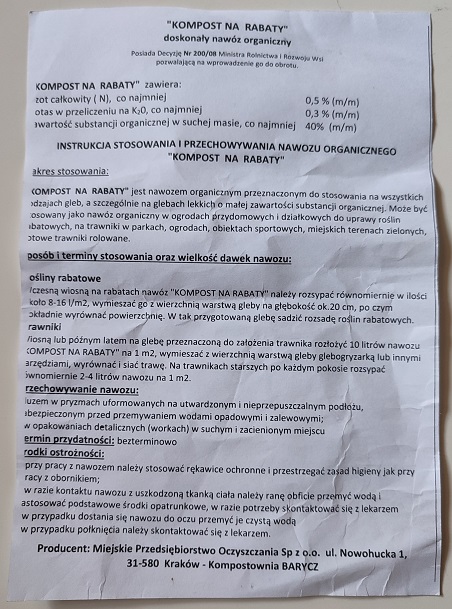 Kiedy pytałam mailowo o certyfikat kompostu, w odpowiedzi dowiedziałam się, że taka informacja podawana jest podczas zakupu kompostu. Całkiem możliwe, że ja coś przeoczyłam za pierwszym razem, ale za drugim razem, faktycznie przy kasie był stosik skserowanych instrukcji i taką też mi wręczono.