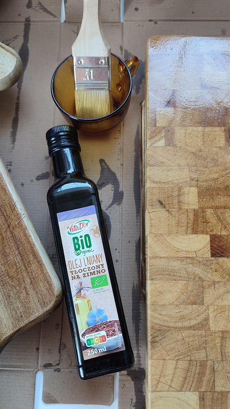 - Nałożenie oleju – ja używam oleju lnianego