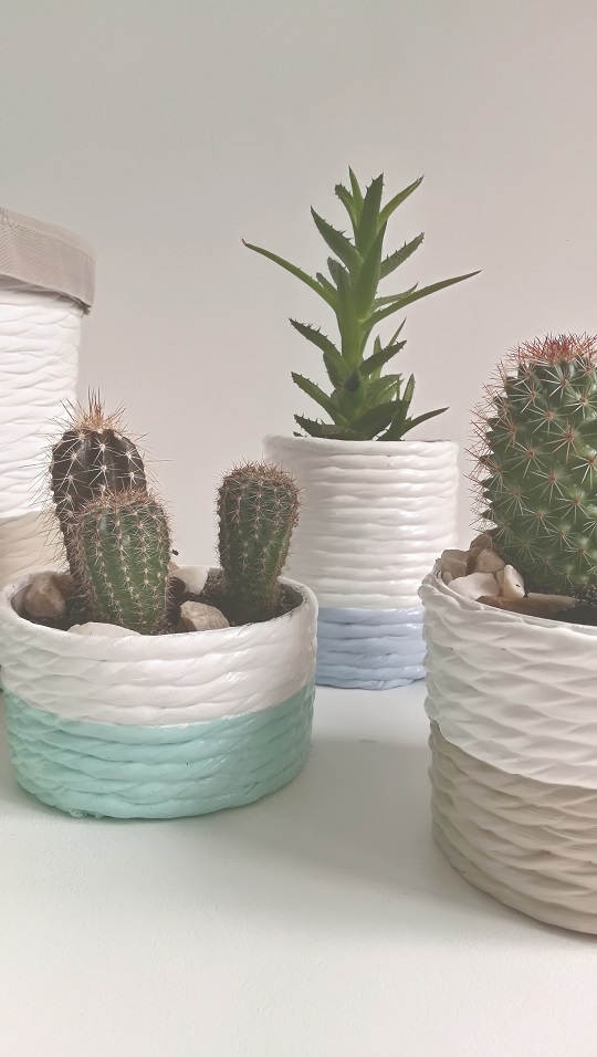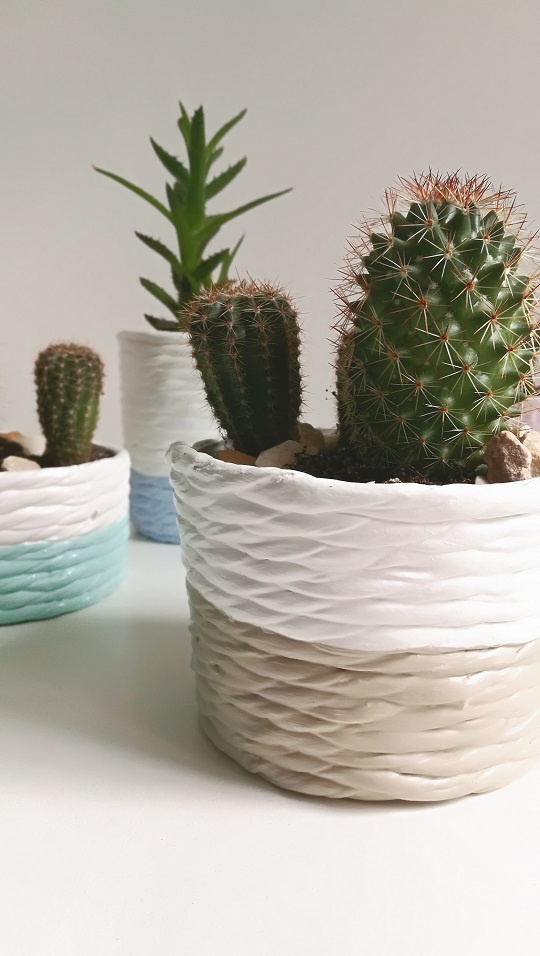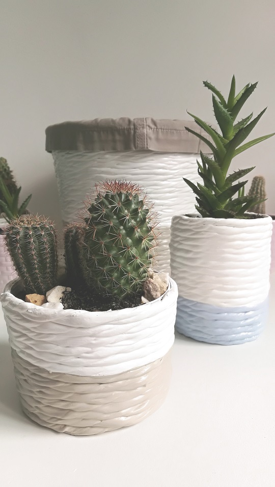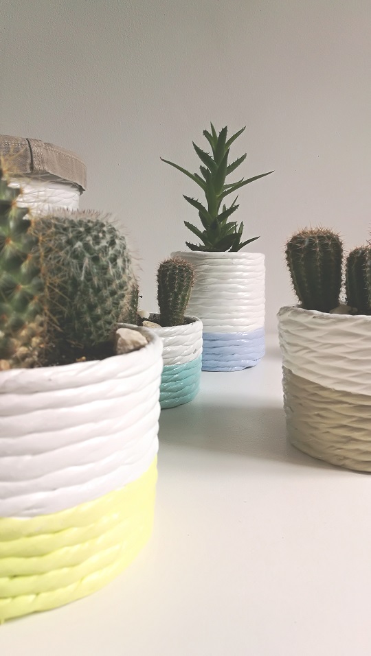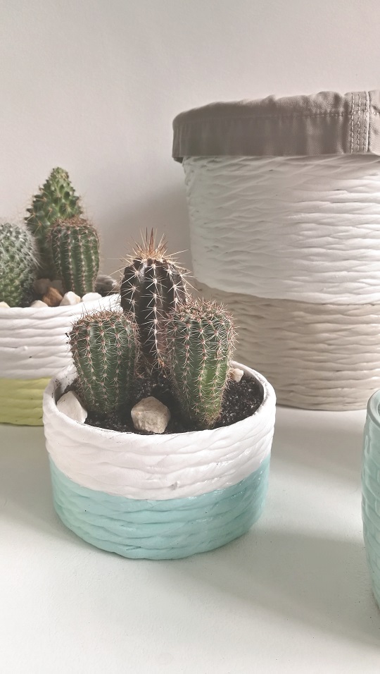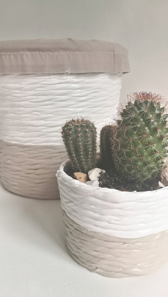 Po pierwszej doniczce z bawełnianego warkocza, miałam ochotę na więcej. Super wyglądają donice/wiaderka owinięte sznurem. Minus jest taki, że te efektowne, grube sznury są drogie. Korzystniej jest kupić gotowy kosz w sieciówce, niż owijać swojego śmiecia. Alternatywą może być papierowa wiklina lub bawełna T-shirt.