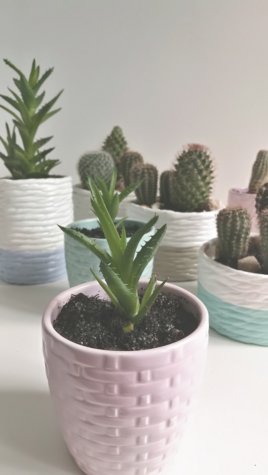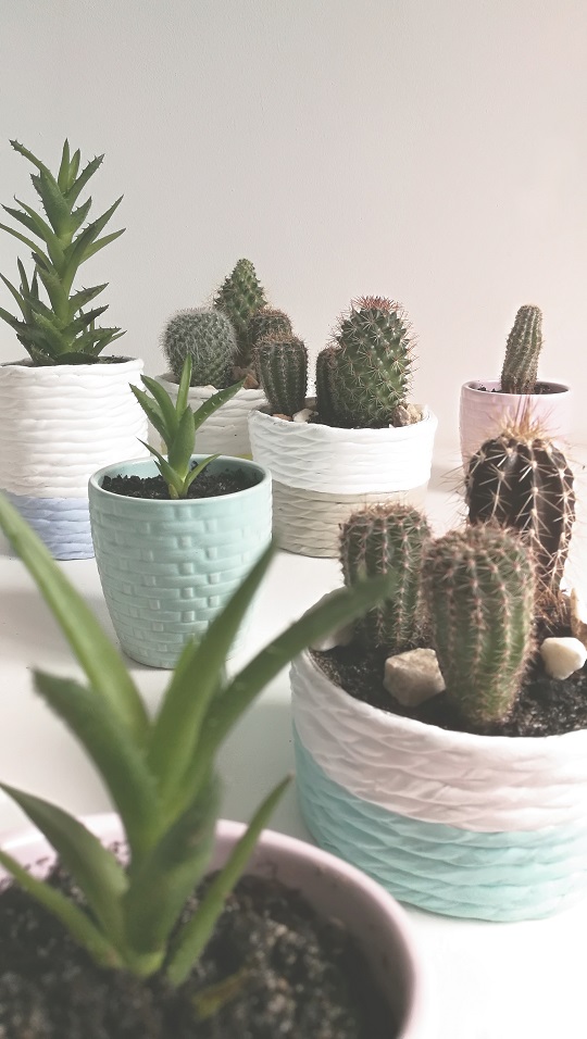 Gotowe :). Moja mini kolekcja kaktusów w nowych doniczkach. Nie mają dziurek w dnie, za to solidny drenaż. Wiaderko dostało nowe poszycie ze spodni syna.