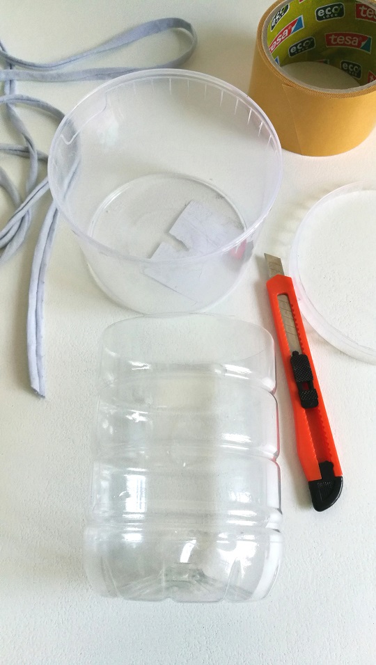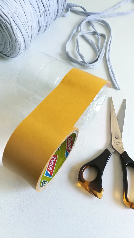 Taśma klejąca tesa®, której użyłam jest przeznaczona do wykładzin oraz jak widać innych robótek ;). Mocno trzyma bawełnę na miejscu. Zdecydowanie wygodniejsze i bardziej estetyczne rozwiązanie, niż klejenie klejem na gorąco. Na wszystkie pojemniki zużyłam 5 metrów taśmy klejącej ( rolkę ).