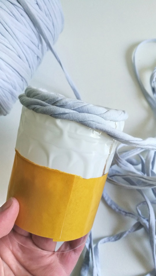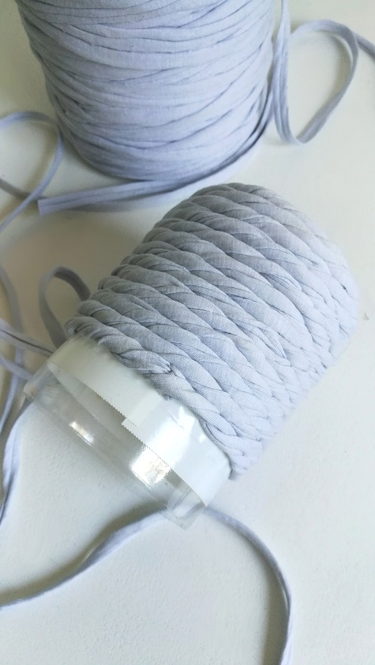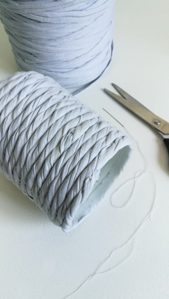 Ile bawełny potrzebujesz? To zależy oczywiście od wielkości pojemnika. Na wiaderko ( ok. 20cm wysokości ) zużyłam łącznie 40 metrów ( 2×20 metrów bawełny T-shirt ).