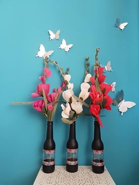 Takiej ilości butelek do pomalowania nie byłabym w stanie zebrać, gdyby nie wsparcie pracowników zaprzyjaźnionej restauracji. Uczestniczki warsztatów również dostarczyły dwie siaty puszek. Malowaliśmy je farbą tablicową Space Creation. Kto miał ochotę bardziej poszaleć, były do dyspozycji taśmy malarskie Tesa. Na koniec sznureczki do dekoracji od Bobbiny i wazoniki jak malowane :).