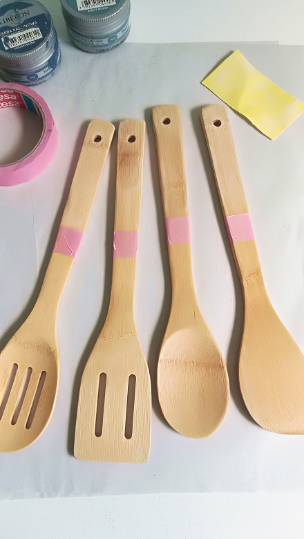 Okleiłam taśmą malarską rączki i papierem ściernym starłam jakąś powłokę w miejscu gdzie miał być kolor. Jakąś, bo pojęcia nie mam czym były impregnowane… Jeśli byłby to olej, to należy zetrzeć maksymalnie do surowego drewna, żeby farba się trzymała.