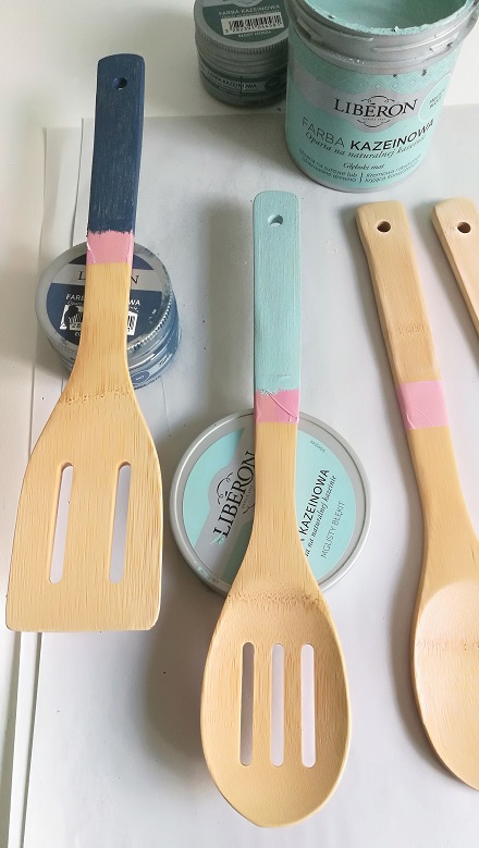 Pozostaje pomalować na wybrany kolor. Łącznie dwie warstwy, w odstępach czasu. Farby kazeinowe cechuje bardzo dobra przyczepność, trwałość i matowy efekt. Niemniej warto rozważyć zabezpieczenie uchwytów na przykład lakierem bezbarwnym. Jeśli użyjecie farb akrylowych, nie ma już takiej konieczności. Farby kredowe zdecydowanie wymagają zabezpieczenia.