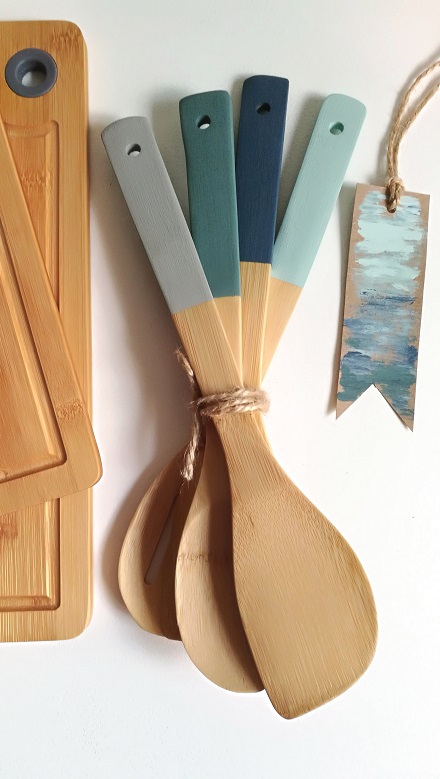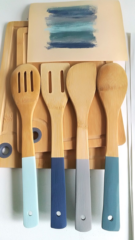 Kupiłam bambusowy zestaw tylko dlatego, że akurat był skromny wybór drewnianych łyżek i zero desek w Pepco. Tych surowych, drewnianych nie trzeba szlifować przed malowaniem. Ewentualnie po pierwszej warstwie przeszlifować podniesiony włos drewna.
