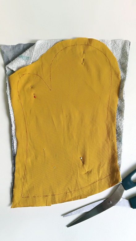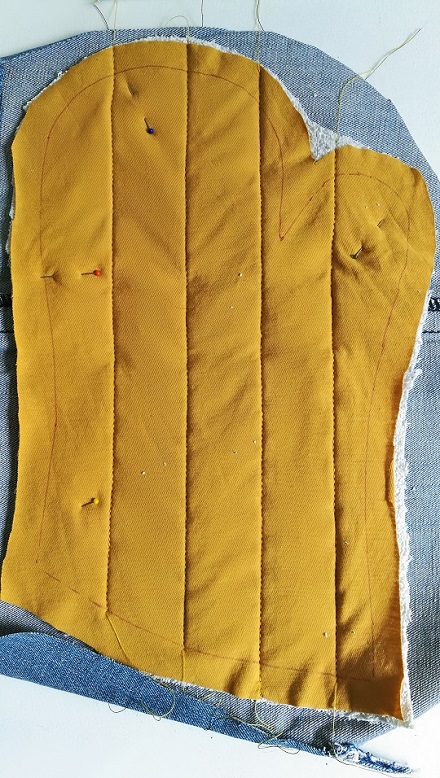 Mamy dwa komplety prostokątów, które składamy jeansem do jeansu. Spinamy szpilkami i zszywamy według zaznaczonego obrysu rękawicy na bawełnie. Z prostokątami chodzi o to, żeby wszystkie 6 warstw materiałów były zszyte i nic nie uciekło. Wycięcie od razu rękawic według szablonu, to zdecydowanie trudniejsza opcja.