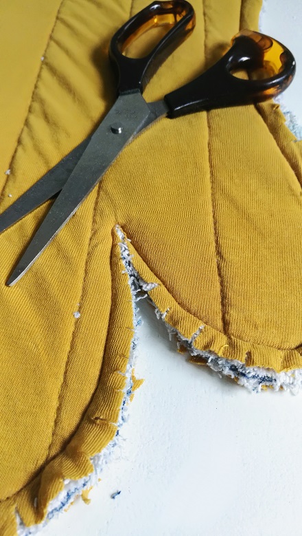Najważniejsze i absolutnie konieczne jest zrobienie nacięć na łukach. W szczególności między kciukiem, a resztą rękawicy. Tak, żeby nie naciąć szwu, jednak dość mocno. Bez tego, po przewróceniu na prawą stronę, szwy będą ciągnąć tkaniny, a rękawica nie będzie się ładnie układała.